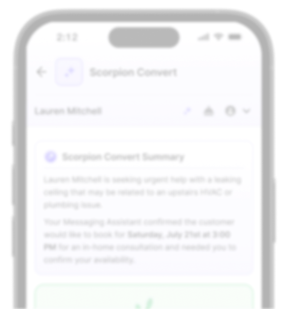 Your leads and future revenue want immediate responses from someone who has the answers. They won't wait. Scorpion Convert responds instantly with smart, helpful answers that capture attention, qualify prospects and book more jobs, automatically.